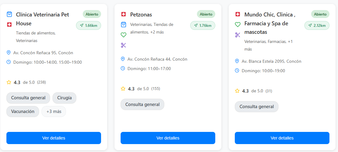 PetServiceConcon te ayuda a ubicar veterinarias cercanas, abiertas y disponibles cuando más lo necesitas. También permite encontrar farmacias, tiendas y servicios esenciales para tu mascota, mostrando horarios y distancia real desde la ubicación del usuario.