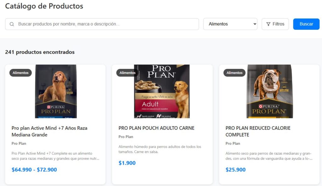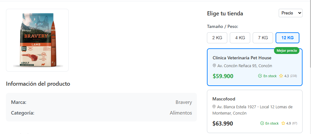 Revisa productos, marcas y precios ofrecidos por tiendas locales. Todo lo necesario para el día a día de tu mascota.